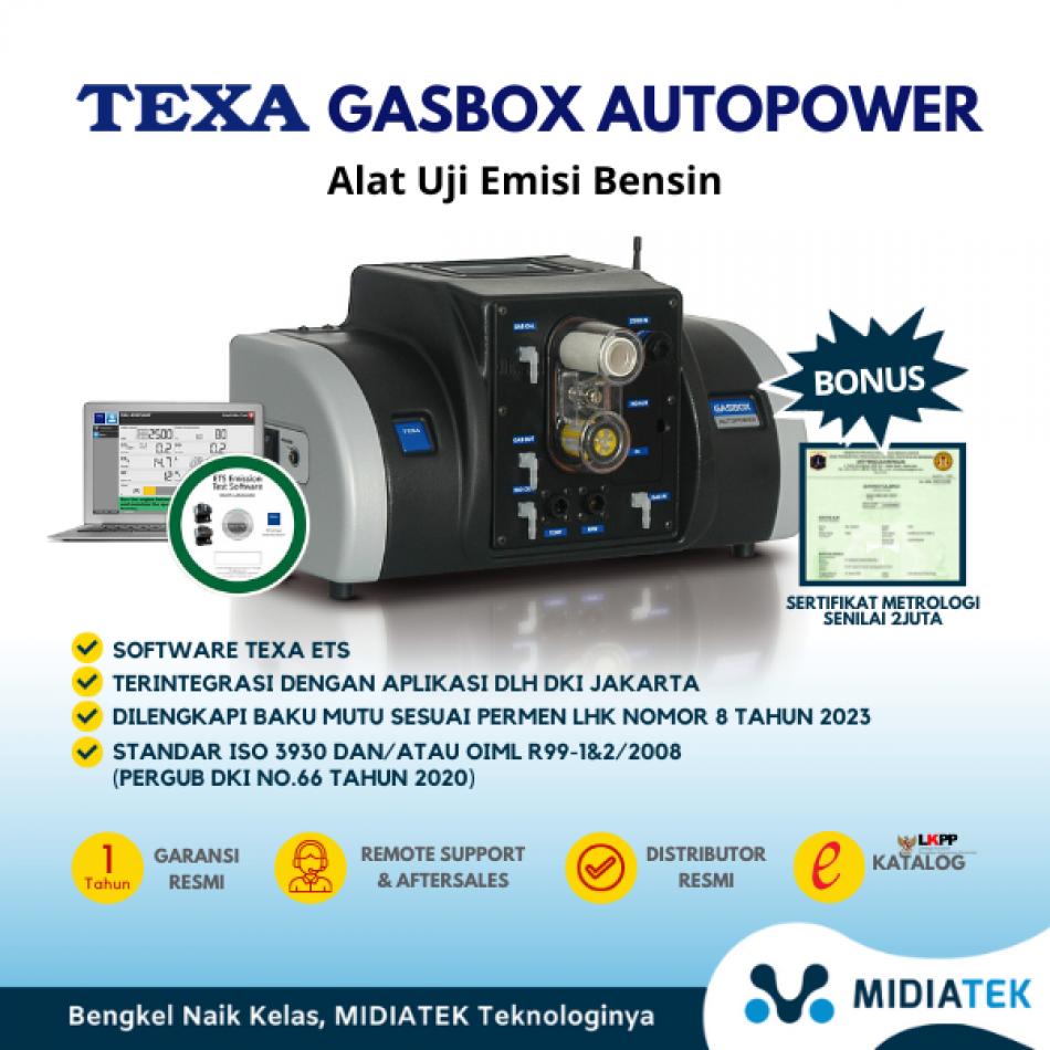 TEXA Gasbox Autopower GASBOX Autopower adalah alat analisa gas buang untuk bensin, LPG, dan mesin berbahan bakar metana. Alat ini menggabungkan ruang analisis TEXA dengan dilengkapi troli praktis untuk memudahkan pergerakan ataupun perpindahan di sekitar bengkel.